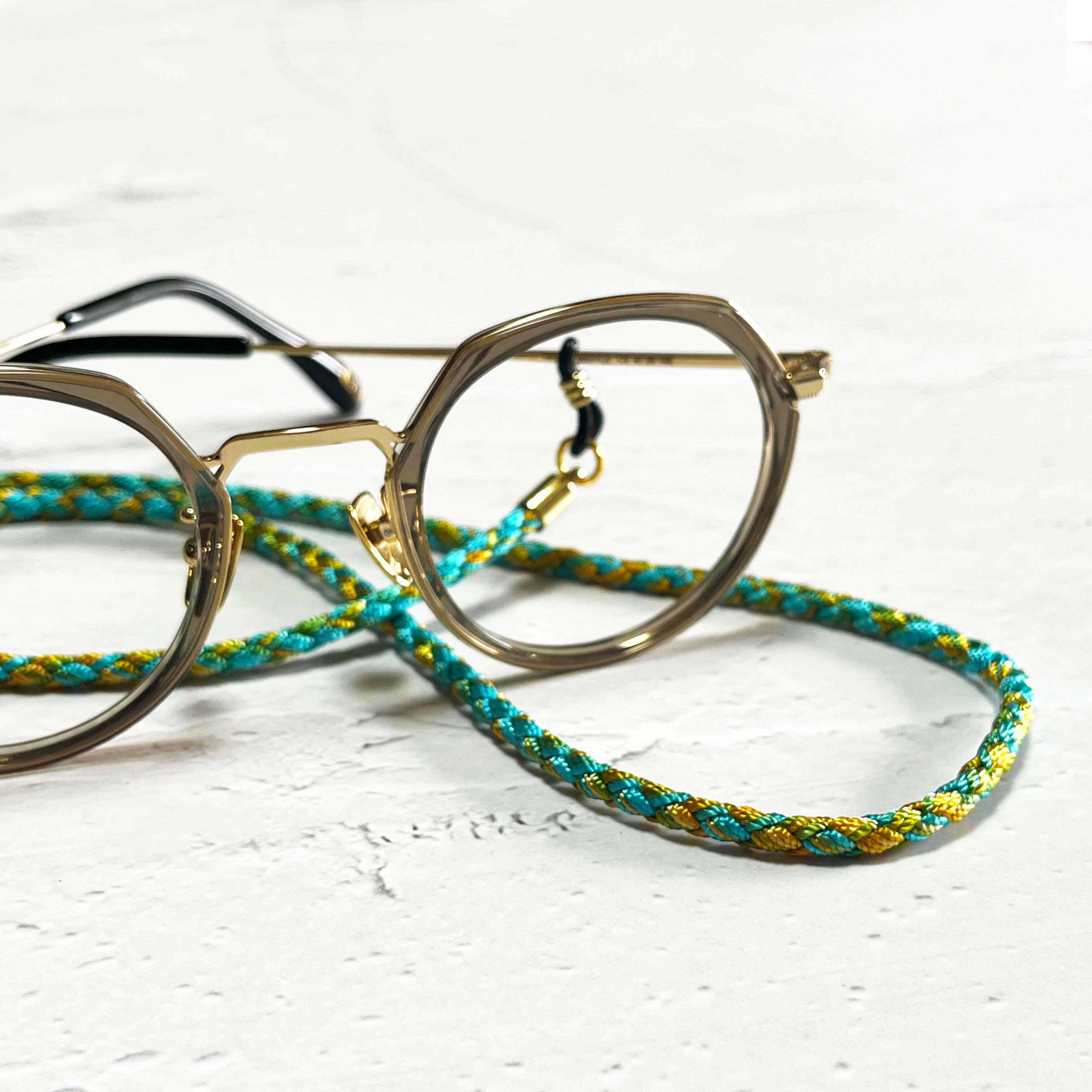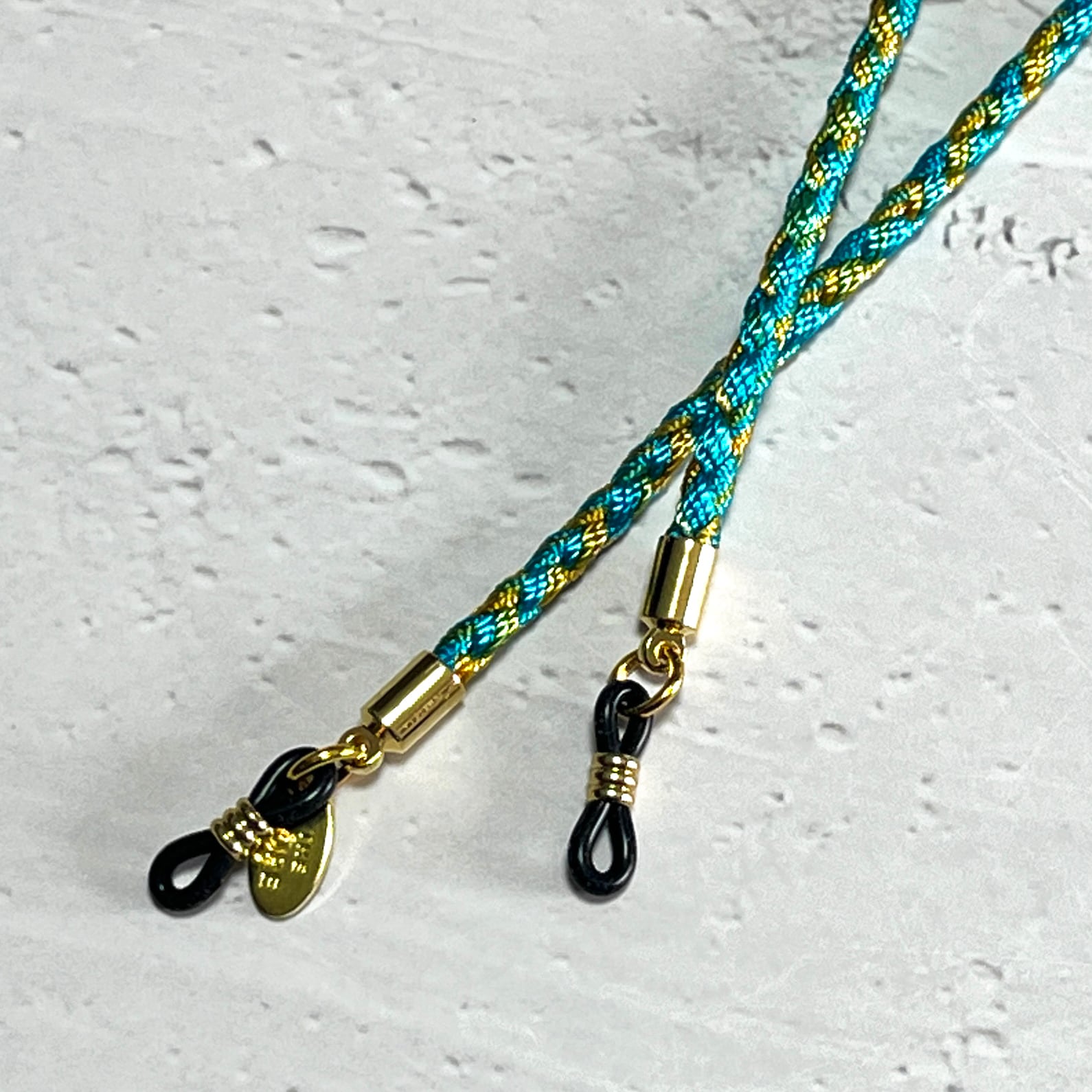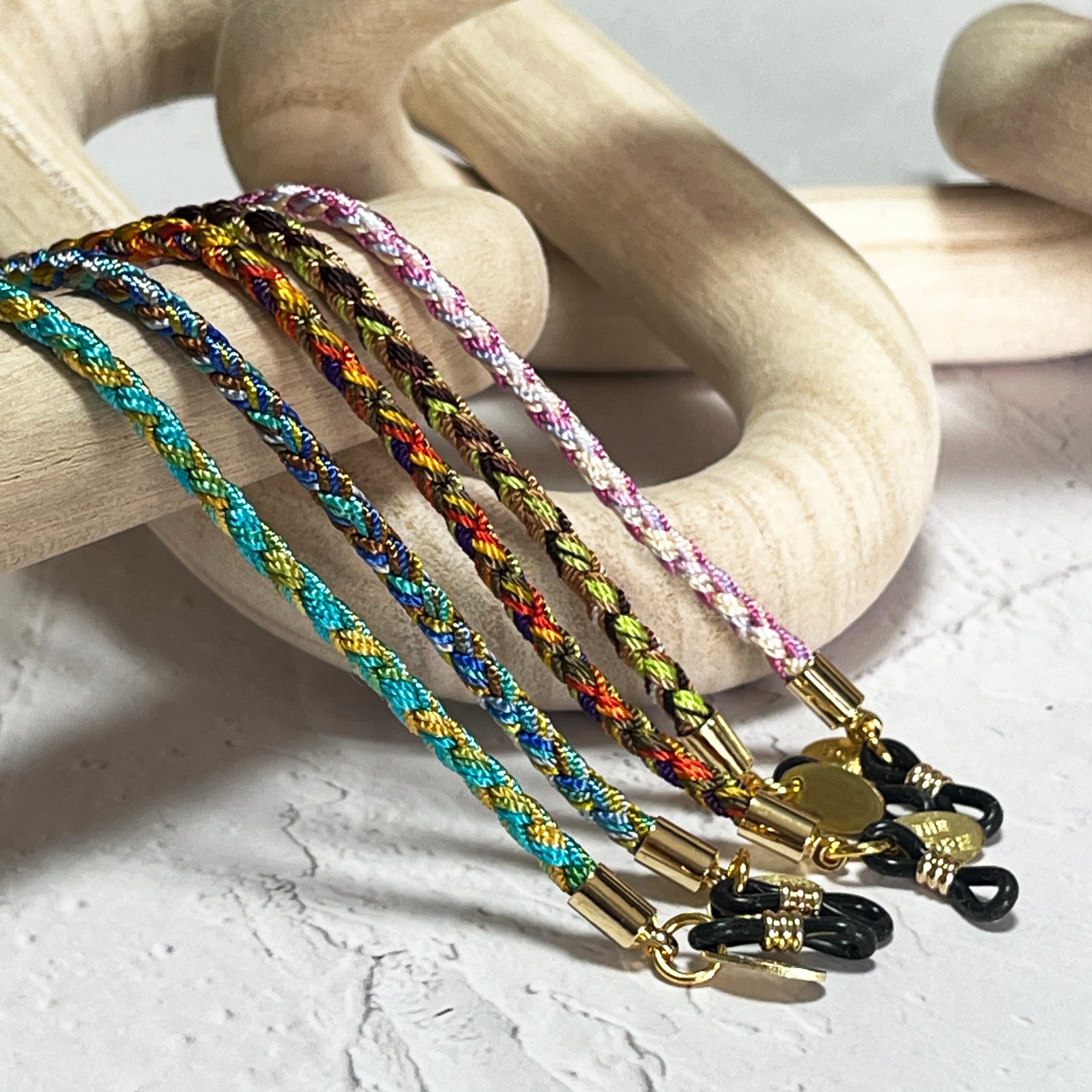 繊細に編み上げられた美しいコードに、華やかさを引き立てるゴールドパーツをあしらったグラスコード。しなやかな質感と軽やかな着け心地で、眼鏡やサングラスに上品なアクセントを添えます。カラフルでありながら洗練された佇まいは、シンプルな装いに程よい華やかさをプラス。日常使いはもちろん、特別なシーンでもひときわ輝く存在感を放ちます。